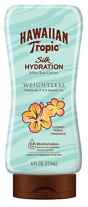 Hawaiian Tropic Silk Hydration Weightless after sun is a moisturizing after sun with lotion and gel ribbons that feels as if it is barely on.