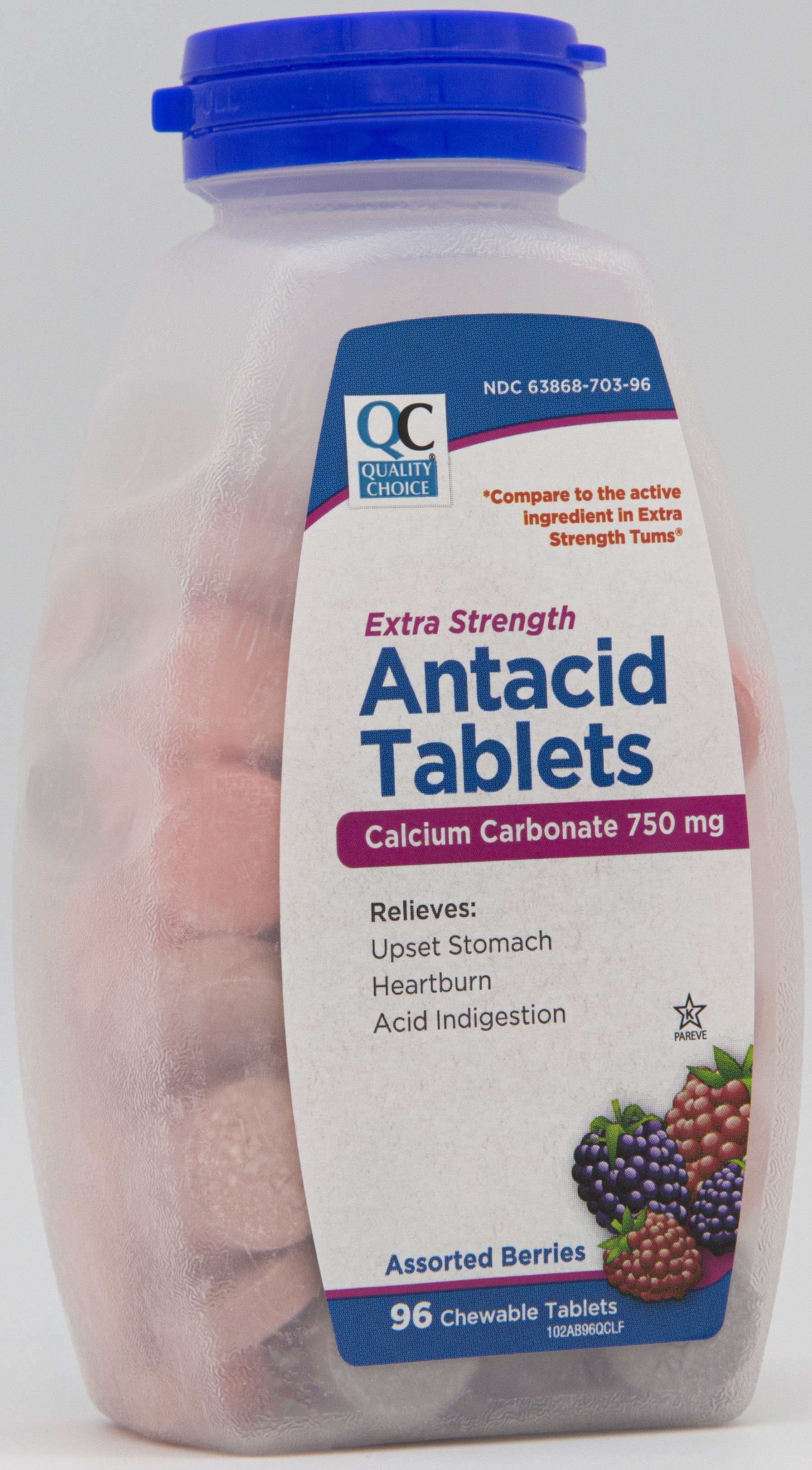 Need fast-acting, ultra strength heartburn relief you can count on? Quality Choice Extra Strength with 96 chewable tablets in assorted berries flavor is here for you. With 750 mg of calcium carbonate in each tablet, it goes to work in seconds, traveling directly to the source of the heartburn, upset stomach, or acid indigestion to bring relief.