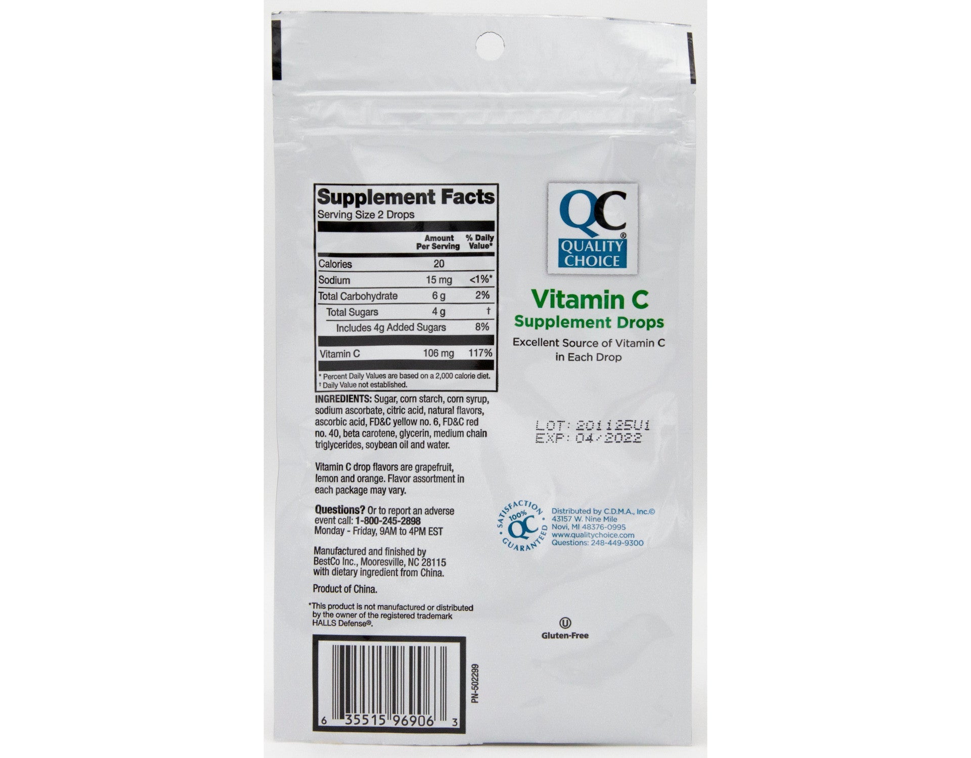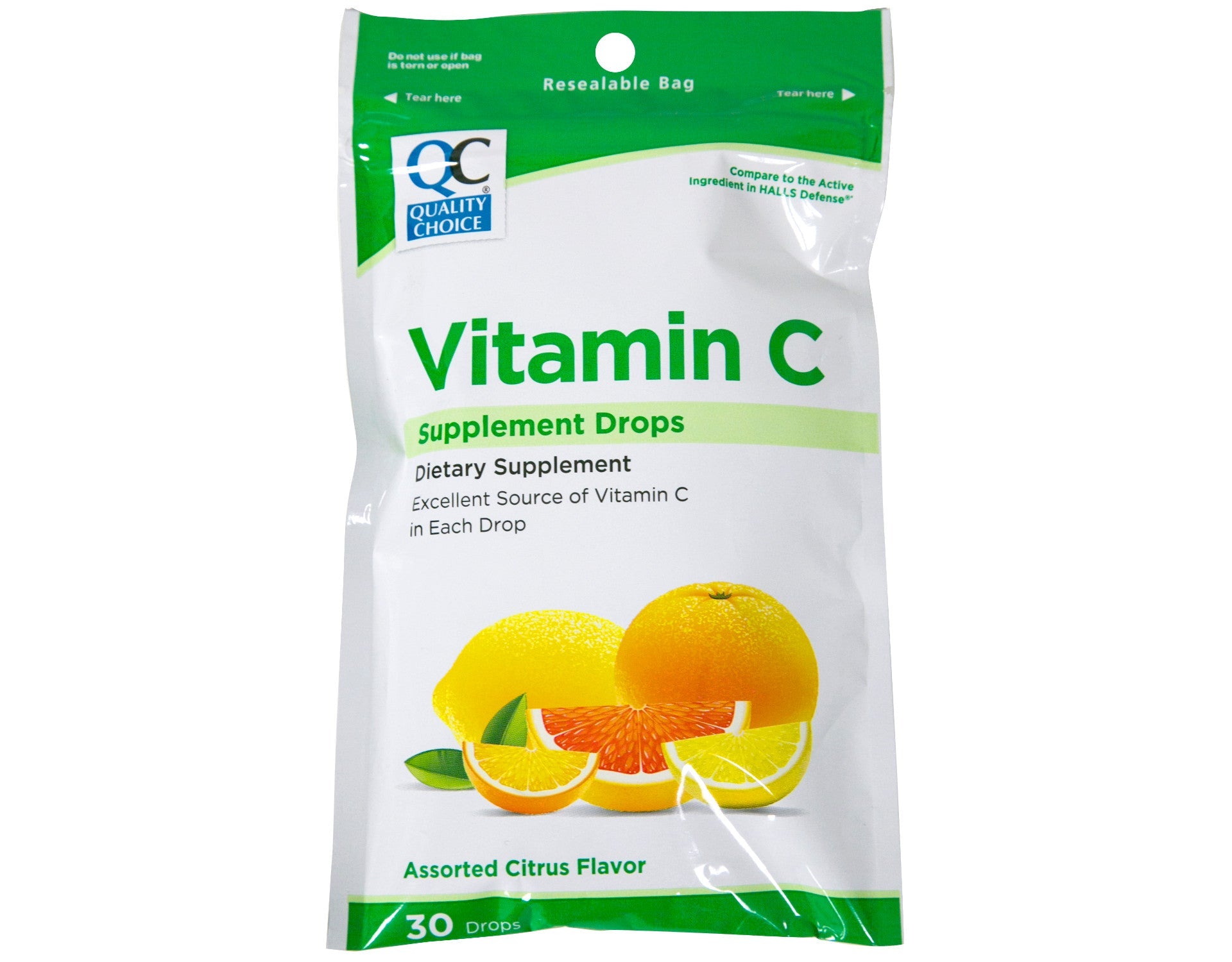 Quality Choice Vitamin C Supplement Drops 30 Count: Dietary Supplement, Excellent Source of Vitamin C in Each Drop. Vitamin C drop flavors are grapefruit, emon and orange.