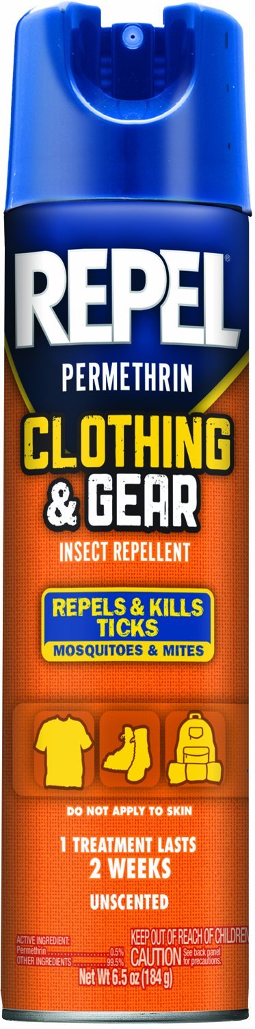 Repel clothing and gear insect repellent 6.5 oz. aerosol spray contains permethrin to kill and repel mosquitos , ticks and mites. not to be applied to skin.