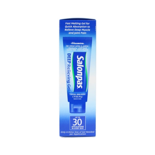 Salonpas deep pain relieving gel for minor aches & pains: backache, stiff neck, joint pain, and sore muscle. 3 powerful pain fighting ingredients. Fast-acting and absorbing. Lasts up to 8 hours and up to 30 applications in every box.