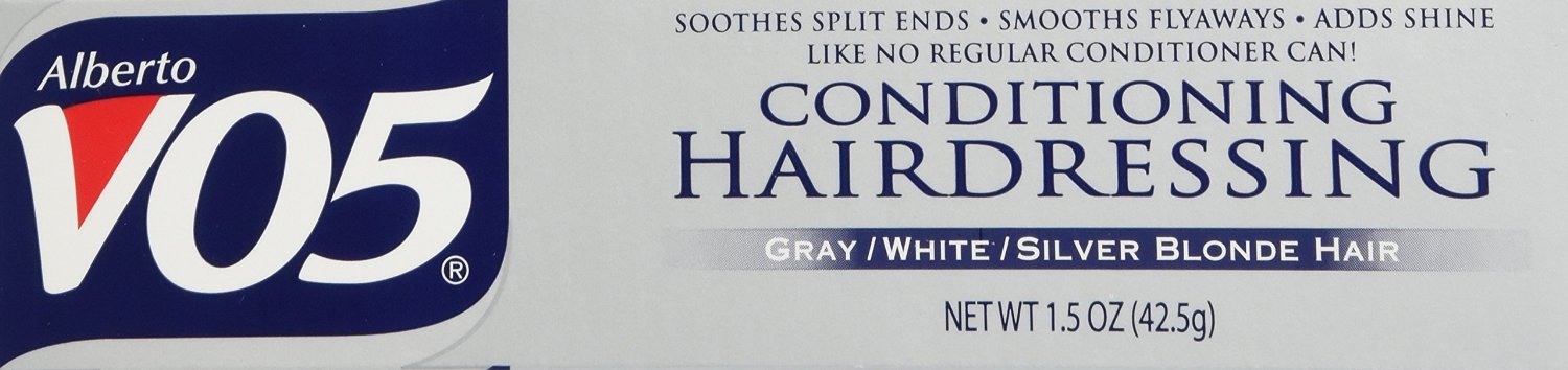 VO5 Conditioning Hairdressing Gray/White/Silver Blonde Hair. Revitalize dull, dry hair. The unique formula has an advanced blend of five of the earth's best moisturizers and emollients. 100% concentrated - contains no water or alcohol. Control your split ends. Smooth flyaways. Calm frizzies. Add shine. Give your hair great manageability. Directions: Squeeze out a tiny amount into the palm. Massage between palms. Apply just where needed. Add shine by working into hair. Let natural highlights shine through.